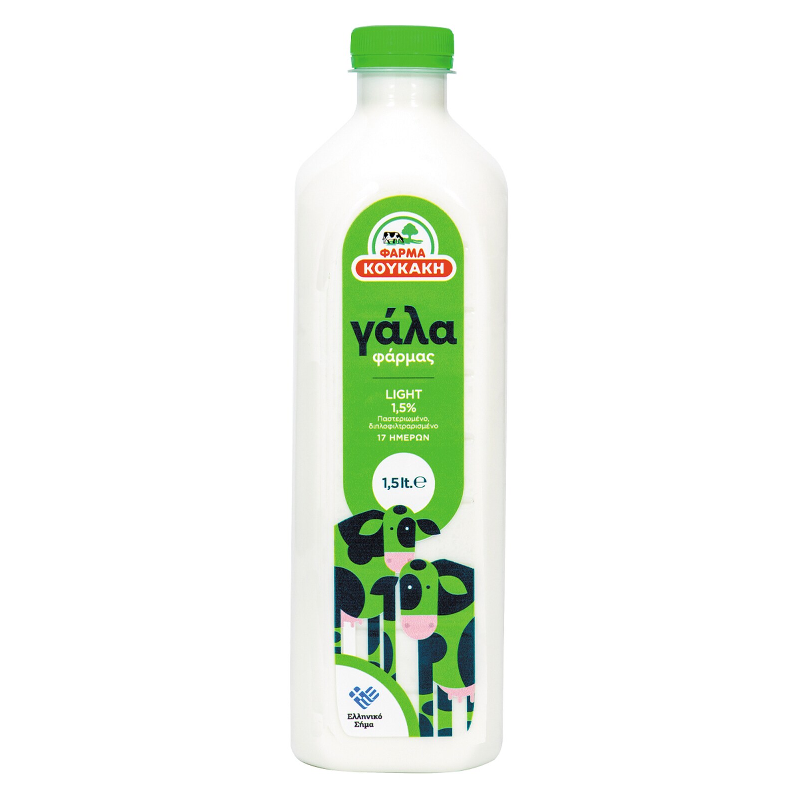 Γάλα φάρμας ελαφρύ 17 ημερών. Ημιαποβουτυρωμένο διπλοφιλτραρισμένο, ομογενοποιημένο και θερμικά επεξεργασμένο σε θερμοκρασία παστερίωσης, αγελαδινό γάλα. Από 100% ελληνικό γάλα ανώτερης ποιότητας, που διατηρεί όλα τα χαρακτηριστικά του φρέσκου γάλακτος αναλλοίωτα, με διάρκεια ζωής 17 ημέρες και νέα πρωτότυπη συσκευασία με τετράγωνη βάση για ευκολότερη χρήση.